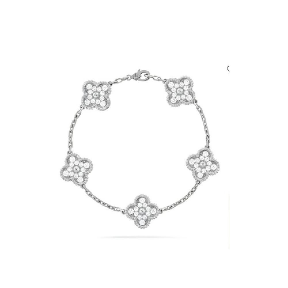 * التصميم: يتميز السوار بتصميمه الساحر الذي يتكون من خمس وحدات من البرسيم الرباعي، كل واحدة منها مرصعة بالكامل بكريستالات لامعة ومتلألئة. يحيط بالكريستالات إطار معدني مصقول بدقة، مما يبرز جمالها ويضفي عليها مظهرًا فخمًا وجذابًا.