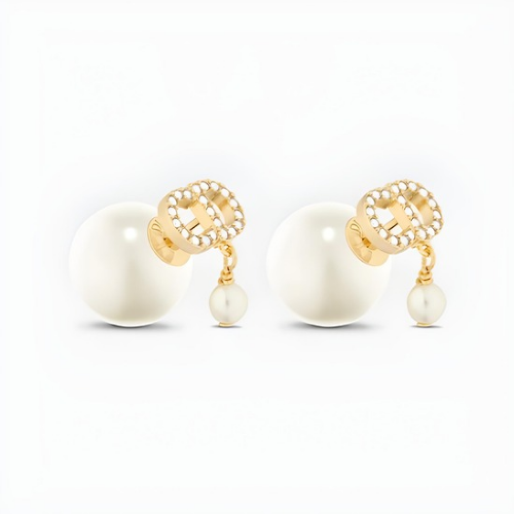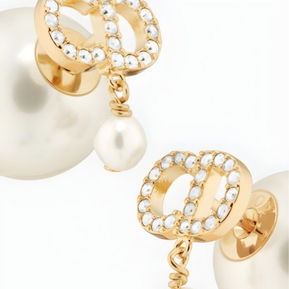 التصميم المزدوج: تتميز الأقراط بتصميمها المبتكر الذي يتكون من قطعتين. القطعة الخلفية عبارة عن لؤلؤة كبيرة وناعمة، بينما القطعة الأمامية تزينها لؤلؤة صغيرة متدلية من شعار "CD" الأيقوني المرصع بكريستالات لامعة.