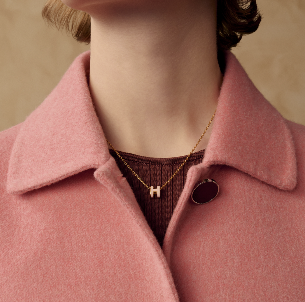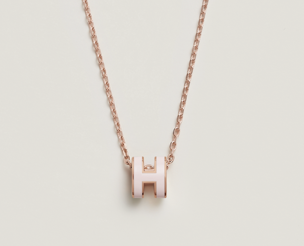 تتميز القلادة بتصميم "لوغو H" الشهير لـ هرمز، في شكل مكعب مصقول صغير الحجم (ميني)، ومُغطى بالمينا (الميناء) بلون وردي ناعم، ومعلق بسلسلة معدنية رقيقة بلون الذهبي. إن بساطة التصميم مع تركيزه على التفاصيل الدقيقة يجعله قطعة أساسية لا غنى عنها.