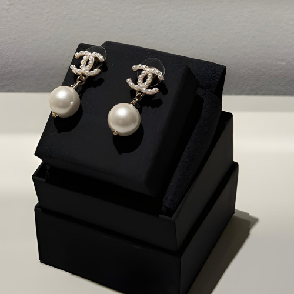 أقراط مستوحاة من تصاميم Chanel الشهيرة، تجمع بين شعار الدار المزدوج CC المزيّن بكريستالات براقة، ولؤلؤة أنيقة تتدلّى بأسلوب راقٍ يُبرز ملامح الوجه بإشراقة ناعمة.