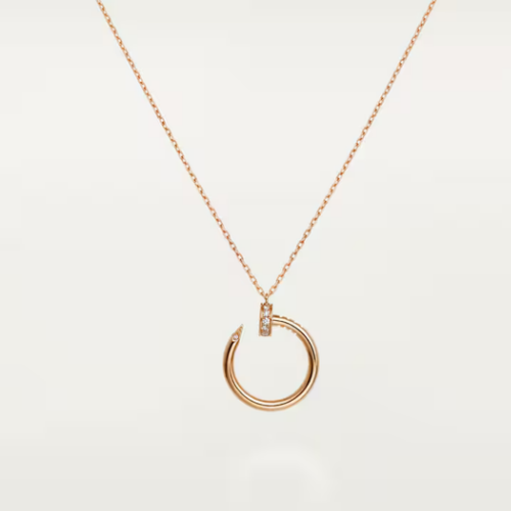 قلادة أنيقة مستوحاة من تصميم Juste Un Clou الأيقوني من Cartier، تأتي بشكل مسمار منحني يلتفّ بشكل دائري انسيابي، مع حلقة أمامية مرصّعة بأحجار لامعة تحاكي الماس، تضيف تباينًا بصريًا ناعمًا ولمسة فخامة واضحة.