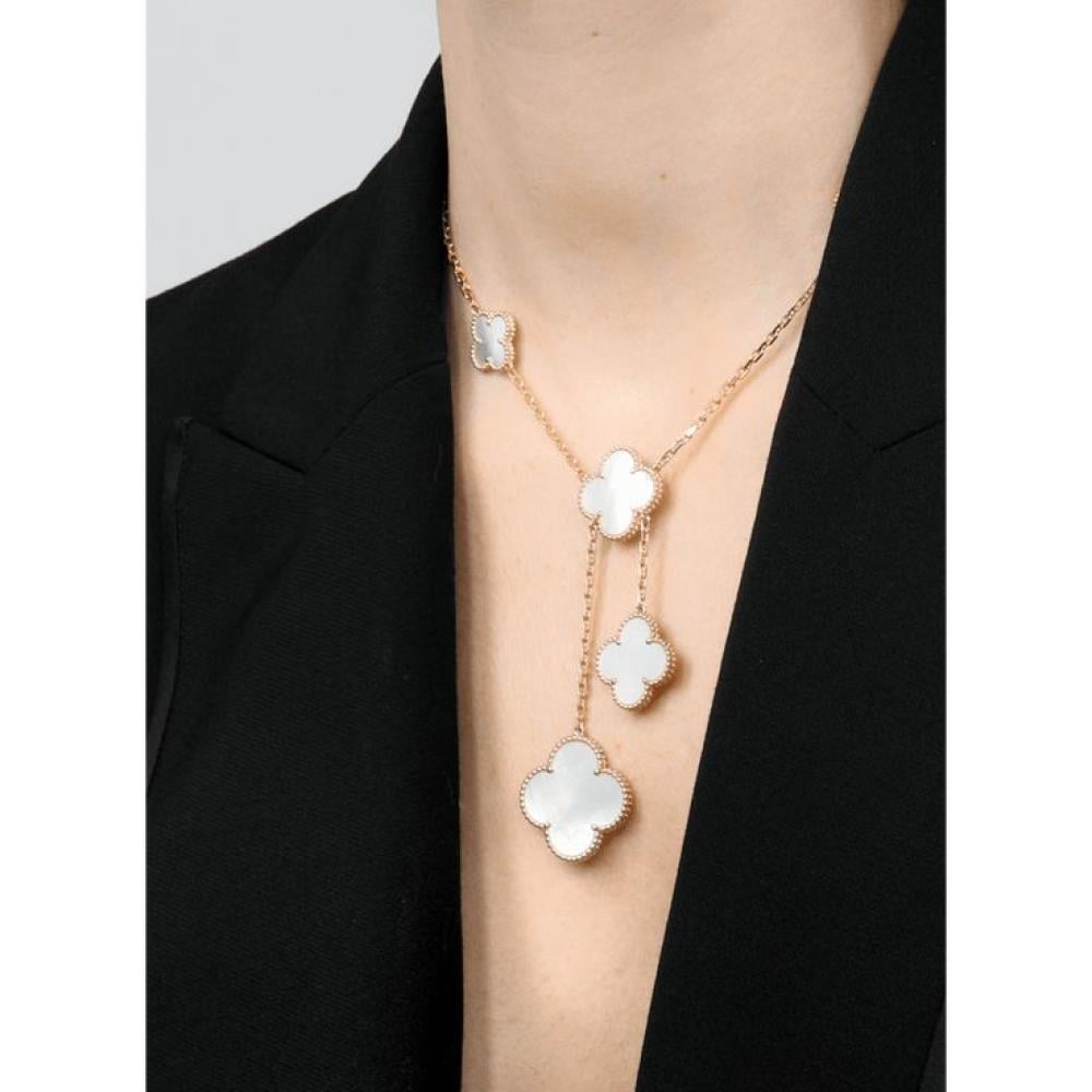 استلهمي أناقتك من سحر التصاميم الكلاسيكية مع هذا الطقم الفاخر بتصميم مستوحى من مجموعة Alhambra الشهيرة. يتميز العقد والأقراط بتفاصيل راقية على شكل ورقة النفل الرباعية، رمز الحظ والجمال، والمصنوعة من عرق لؤلؤ صناعي بدرجات لونية ناعمة تمنحك إشراقة طبيعية.